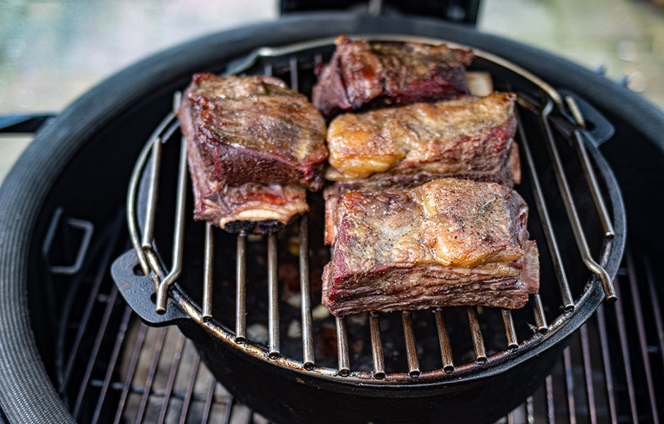 7. Na twee uur kun je de short ribs van het rooster halen en deze in de saus leggen om verder te garen. Sluit de dome en wacht tot ze gaar zijn. Dit kan ongeveer 4 uur duren.